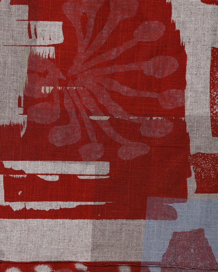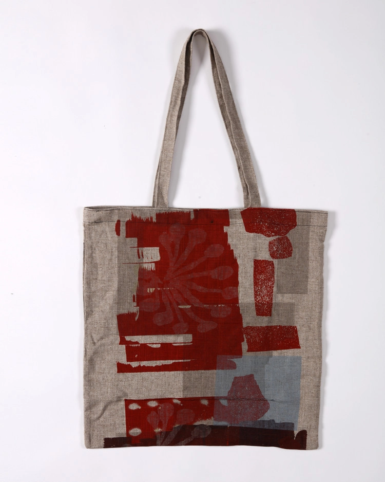직조한듯한 독특한 면마 소재의 원단에 여러 레이어의 이미지가 중첩되어 하나의 그림을 이루는 패브릭 작업입니다.