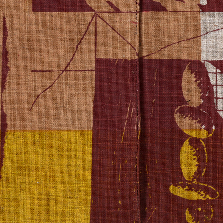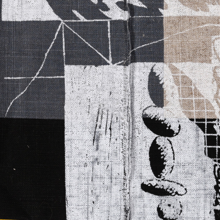 직조된 듯한 독특한 소재의 면마 원단 위에 여러 레이어의 이미지가 중첩되어 하나의 그림을 이루는 패브릭 작업입니다.