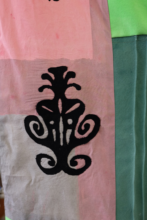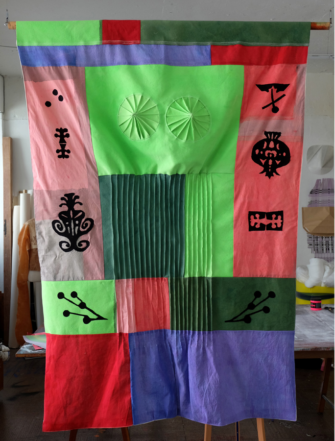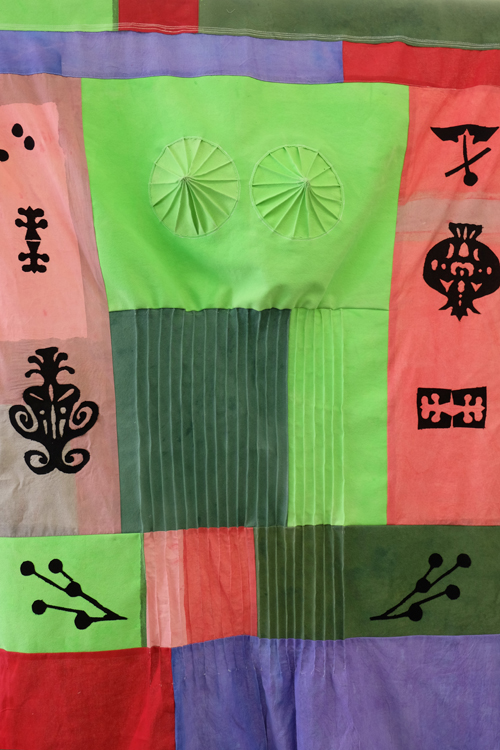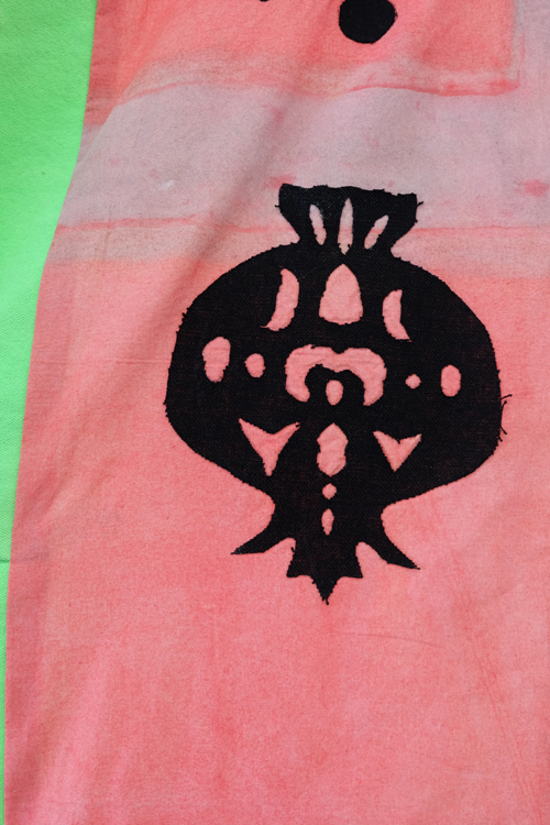 수작업으로 나염한 원단으로 꼴라주한 걸개 그림입니다.